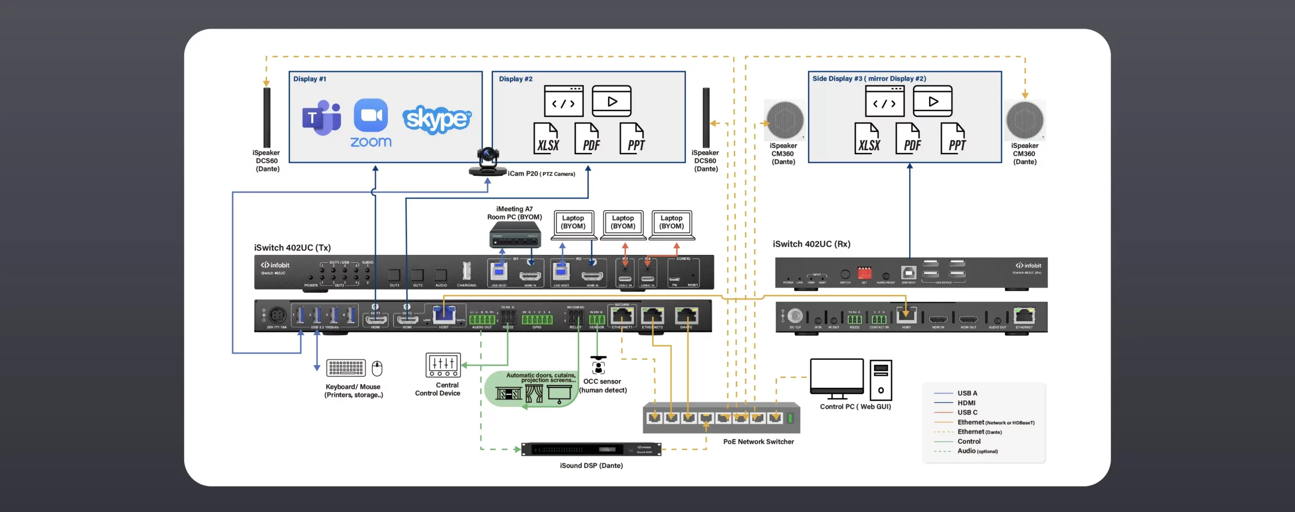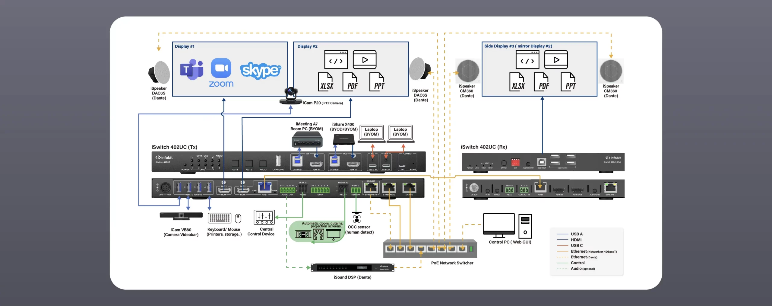 4× 2 interruttore di presentazione di conferenza, integrando video, audio, USB, controllo e Ethernet.